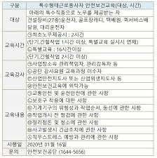 특수형태 근로종사자는 일반 근로자보다 더 많은 위험에 노출될 수 있습니다. 따라서 이들에게 맞춤형 안전교육이 필요합니다. 안전교육을 통해 근로자들은 사고를 예방하고, 안전한 작업 환경을 조성할 수 있습니다. 특히, 건설 현장이나 배달 업무는 사고가 빈번하게 발생할 수 있는 분야이므로, 안전교육은 필수적입니다.